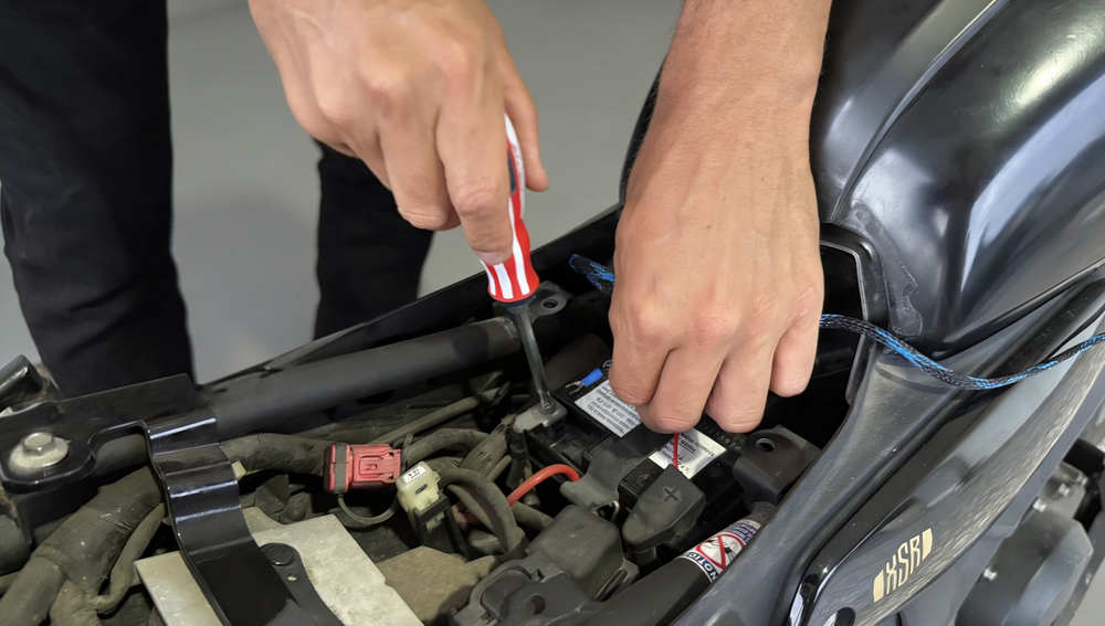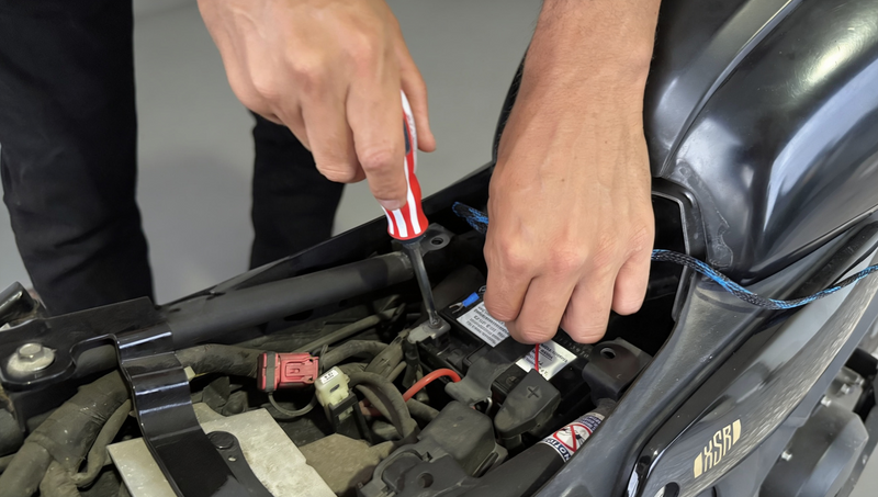 Step 5: Finish the installation by connecting the wiring to the battery terminals. The device will receive power when the motorcycle is on.
