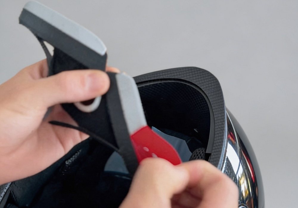 Step 2: Press firmly against the under chin of the helmet, ensuring it sticks properly